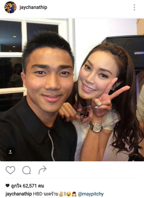 และได้แชะภาพคู่กับแข้งทีมชาติไทย "เจ ชนาธิป" แชะภาพคู่กัน แถมยังมีโมเมนต์หวาน ที่สาวเมย์เข้าไปเช็ดหน้าที่เลอะแป้งให้กับหนุ่มเจแบบแนบชิด พร้อมแคปชั่นชวนจิ้นว่า "ถึงเลอะก็รัก" ทำเอาแฟนคลับแห่เข้ามาคอมเมนต์ลลุ้นให้ทั้งคู่กิ๊กกันจริงๆ