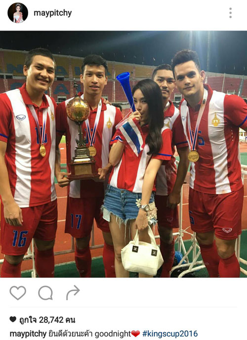6 มิ.ย.59 ทำเอาแฟนคลับฟินจิ้นกระจายเลยทีเดียว เมื่อนักแสดงสาวสุดฮอต "เมย์ พิชญ์นาฏ สาขากร" ไปเชียร์ทีมช้างศึกในการแข่งขันนัดชิงชนะเลิศฟุตบอลชิงถ้วยพระราชทาน คิงส์ คัพ ครั้งที่ 44 ซึ่งทีมชาติไทยสามารถเอาชนะ จอร์แดนไปได้ 2-0 คว้าถ้วยพระราชทานไปได้สำเร็จ