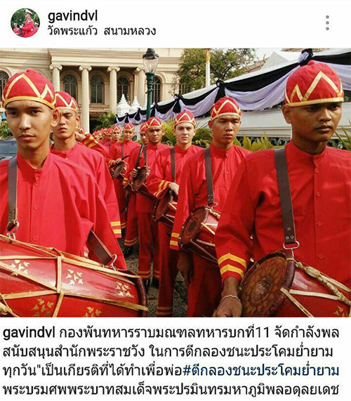 18 ต.ค. 59 ผู้สื่อข่าวรายงานว่า ที่อินสตาแกรม @gavindvl พลทหารกวินท์ ดูวาล หรือ กวิน ทรีทูวัน นักร้องหนุ่มที่ไปเป็นทหารเกณฑ์รับใช้ชาติ ได้โพสต์ภาพตัวเองขณะทำหน้าที่ตีกลองชนะประโคมย่ำยาม ร่วมกับเพื่อนทหารจากกองพันทหารราบมณฑลทหารบกที่ 11 (พัน ร. มทบ.11) ในพระราชพิธีพระบรมศพ พระบาทสมเด็จพระปรมินทรมหาภูมิพลอดุยลเดช ณ พระที่นั่งดุสิตมหาปราสาท ในพระบรมมหาราชวัง พร้อมข้อความว่า "กองพันทหารราบมณฑลทหารบกที่ 11 จัดกำลังพลสนับสนุนสำนักพระราชวัง ในการตีกลองชนะโคมย่ำยามทุกวัน เป็นเกียรติที่ได้ทำเพื่อพ่อ #ตีกลองชนะประโคมย่ำยามพระบรมศพพระบาทสมเด็จพระปรมินทรมหาภูมิพลอดุลยเดช"