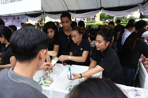 ศิลปินจาก บริษัทอาร์เอส จำกัด (มหาชน) และดารานักแสดงช่อง 8 และ ค่ายอาร์สยาม นำโดย ใบเตย อาร์สยาม,มังกร-ปภาวิน,ลาล่า-ลูลู่ อาร์สยาม, มด-ณปภัช และ มาร์ติน มิดาล นำริบบิ้นดำ ขนม น้ำ มาแจกให้กับประชาชนที่รอเฝ้าถวายสักการะ พระบาทสมเด็จพระปรมินทรมหาภูมิพลอดุลยเดช ณ พระบรมมหาราชวัง