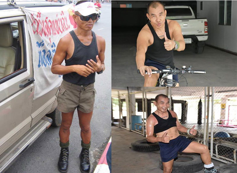“ครูพลาม” ด.ต.พลาม พรมจำปา ในปี 2548 (ซ้าย) และปัจจุบัน (ขวาบนและขวาล่าง)