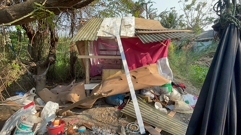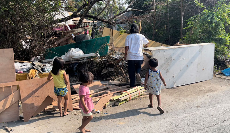 น.ส.สัญญาลักษณ์ สายหมี อายุ 39 ปี เเม่ลูก 3 อาชีพเก็บของเก่า เปิดเผยว่า ก่อนหน้านี้ ตนอาศัยอยู่ที่ จ.นครปฐม ตนมีลูกติด 1 คน เป็นผู้หญิงอายุ 6 ปี หลังจากมีสามีใหม่ก็พากันมาอยู่แถว อ.ไทรน้อย จ.นนทบุรี อยู่กินกันมา 5 ปี มีลูกด้วยกัน 2 คน ผู้ชายอายุ 4 ปี ผู้หญิง 2 ปี ตนมาอาศัยอยู่ตรงนี้ได้ประมาณ 8 เดือน เพราะเมื่อไม่นานมานี้ตนกับสามีได้ทะเลาะกันถึงขั้นแยกทางกัน ตนจึงต้องเลี้ยงลูกเพียงลำพัง เวลาไปเก็บขวด เก็บของเก่า ก็ต้องกระเตงลูกทั้ง 3 คนไปด้วย