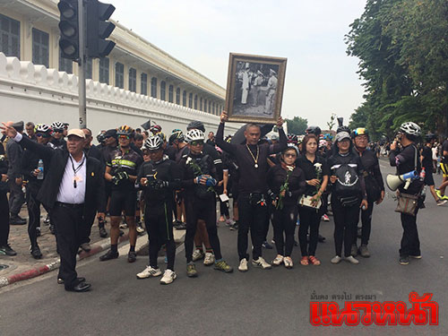 โดยในวันนี้ได้มีสมาชิก สมาคมกีฬาจักรยาน ทุกเพศทุกวัยกว่า 300 คน นำโดย นางสุดา ทวีกาญจน์ นายกสมาคมกีฬาจักรยาน จ.ราชบุรี ได้ปั่นจักรยานมาจาก อ.บ้านโป่ง จ.ราชบุรี ตั้งแต่เวลา 05.00 น. ก่อนเดินทางมารวมตัว ที่บริเวณนอกกำแพง ฝั่งทิศตะวันตก ของพระบรมมหาราชวัง เพื่อร่วมถวายสักการะพระบรมศพ ทั้งนี้พสกนิกรจากราชบุรี ได้นำพระบรมฉายาลักษณ์พร้อมดอกไม้สีขาว เตรียมนำมาวางไว้ที่ริมกำแพงพระบรมมหาราชวัง ก่อนที่ทั้งหมดก้มลงกราบภาพพระบรมฉายาลักษณ์อย่างพร้อมเพรียง จากนั้นยังได้ร่วมกันร้องเพลงสรรเสริญพระบารมี ระหว่างที่ร้องหลายคนนำภาพพระบรมฉายาลักษณ์ชูเหนือเกล้าแล้วหลั่งน้ำตาไปด้วยความอาลัย เสร็จแล้วทั้งหมดยังได้ยืนสงบนิ่งเป็นเวลา 89 วินาที