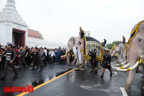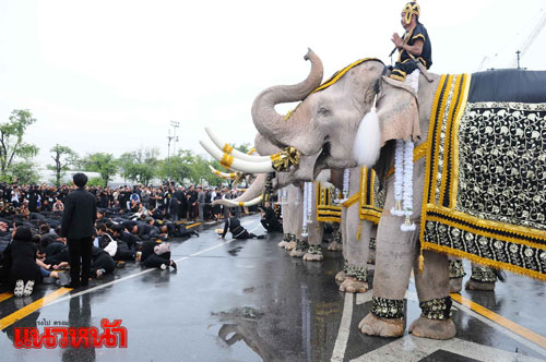 8 พ.ย.59 ผู้สื่อข่าวรายงานว่า เมื่อเวลา 09.50 น. บริเวณด้านหน้าพระบรมมหาราชวัง ฝั่งกระทรวงกลาโหม นายลายทองเหรียญ มีพันธ์ เจ้าของวังช้างอยุธยา แล เพนียด และประธานมูลนิธิคชบาล นำช้างจากวังช้างอยุธยา แล เพนียด จ.พระนครศรีอยุธยา จำนวน 11 เชือก แต่งเครื่องคชาภรณ์สีดำ พร้อมกับผู้แทนคชสารทั่วแผ่นดินกว่า 200 คน เดินทางมาถวายสักการะพระบรมศพ พระบาทสมเด็จพระปรมินทรมหาภูมิพลอดุลยเดช