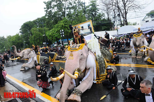 อย่างไรก็ตาม เมื่อถึงเวลาเจ้าหน้าที่วังช้างได้บรรเลงเพลงสรรเสริญพระบารมี ช้างทั้ง 11 เชือก ได้ยืนตรง ซึ่งประชาชนที่อยู่บริเวณโดยรอบได้ร่วมกันร้องเพลง และเมื่อจบเพลงช้างทุกเชือกได้ชูงวงขึ้น พร้อมหมอบลงทำท่ากราบ เพื่อแสดงความเคารพ จากนั้นได้คำรามดังเสียงดังกึกก้อง