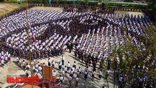 หลังจากนั้น ทุกคนได้แปรรูปขบวนเป็นตัวอักษร ๙ ล้อมรอบด้วยรูปหัวใจและวงโยธวาฑิต บรรเลงเพลง “บารมีองค์ภูมิพล” ที่ อาจารย์สนธยา บันดาล อาจารย์ดนตรีของโรงเรียนเป็นผู้แต่งเนื้อร้องและทำนองด้วยความไพเราะและเนื้อหาที่กินใจ ตามด้วยเพลงสรรเสริญพระบารมี หลังจากนั้น จึงเปิดการเรียนการสอนตามปกติ ท่ามกลางความปลื้มปิติของทุกคนที่ได้ร่วมกันถวายความอาลัยในวันนี้