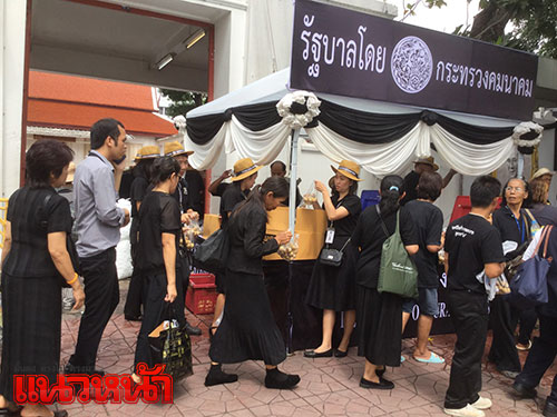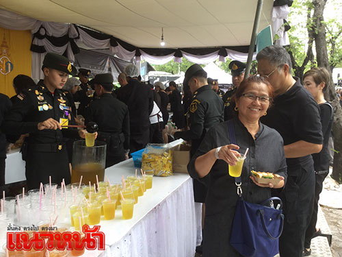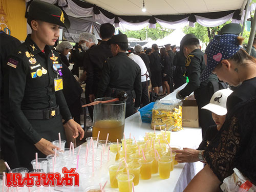 8 พ.ย.59 ที่เต็นท์หน่วยทหารมหาดเล็กรักษาพระองค์ ในสมเด็จพระบรมโอรสาธิราชฯ สยามมกุฎราชกุมาร ซึ่งตั้งอยู่บริเวณท้องสนามหลวงฝั่งทิศใต้ ฝั่งตรงข้ามประตูมณีนพรัตน์ พระบรมมหาราชวัง สมเด็จพระบรมโอรสาธิราชฯ สยามมกุฎราชกุมาร ทรงห่วงใยพสกนิกรที่เดินทางมาถวายสักการะพระบรมศพ พระบาทสมเด็จพระปรมินทรมหาภูมิพลอดุลยเดช ที่พระที่นั่งดุสิตมหาปราสาท ในพระบรมมหาราชวัง จึงทรงพระกรุณาโปรดเกล้าฯ ให้หน่วยทหารมหาดเล็กราชวัลลภรักษาพระองค์ ในสมเด็จพระบรมโอรสาธิราชฯ สยามมกุฎราชกุมาร นำอาหาร ขนม ผลไม้ และน้ำดื่มพระราชทานมาแจกจ่ายให้ประชาชน