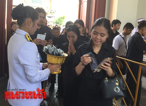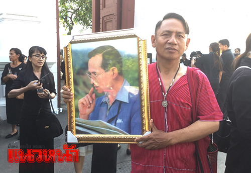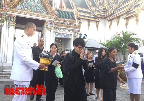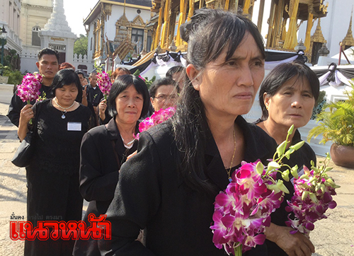 ด้าน น.ส.นริศรา ทิพย์หนองหิน อายุ 25 ปี เจ้าหน้าที่ฝ่ายบริหารงานทั่วไป วิทยาลัยเทคโนโลยีส่องแสงพาณิชยการ ต.พะตง อ.หาดใหญ่ จ.สงขลา กล่าวว่า ตนพร้อมเพื่อนๆ ใช้โอกาสวันหยุดยาวเดินทางมาโดยเครื่องบิน และมาถึงท้องสนามหลวงช่วงตี 4 และเข้ากราบสักการะช่วง 9 โมงเช้าถือว่าเร็วเพราะมีคนมารอคิวเยอะมาก พวกเราตั้งใจมากราบสักการะพระองค์ท่านดีใจที่ได้มากราบ แต่ก็เสียใจน้ำตาไหล ถึงแม้พวกเราจะไม่เคยรับเสด็จฯ ช่วงที่ท่านมีพระชนชีพอยู่แต่ก็เห็นพระองค์ท่านมาตั้งแต่เด็กๆ เห็นท่านทรงงานหนัก และใน จ.สงขลา ก็ได้รับพระราชทานโครงการพระราชดำริ เช่นที่บ้านตน ใน ต.คลองหลา อ.คลองหอยโข่ง มีอ่างเก็บน้ำคลองหลาอันเนื่องมาจากพระราชดำริ และมีโครงการบรรเทาอุทกภัยตามแนวพระราชดำริ คลองระบายน้ำ ร 1 ที่ ต.ควรลัง อ.หาดใหญ่ ทำให้ชาวบ้านมีน้ำทำการเกษตร และแก้ปัญหาน้ำท่วมได้อย่างยั่งยืน