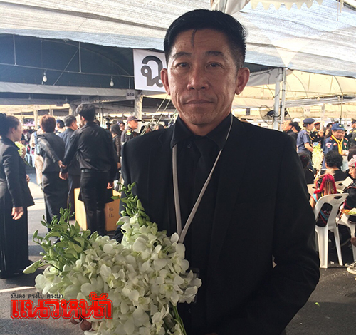 ส่วน นายสมเกียรติ ดุสฎีกาญจน นายกสมาคมผู้ประกอบการสวนกล้วยไม้ไทย กล่าวว่า ตนได้เป็นตัวแทนสมาคมฯ นำกล้วยไม้หลากสีพันธุ์ต่างๆ มาแจกจ่ายให้ประชาชนที่จุดพักรอภายในสนามหลวง เพื่อนำขึ้นกราบสักการะพระบรมศพ ด้วยสมาคมผู้ประกอบการสวนกล้วยไม้ไทยตั้งใจทำความดีเพื่อถวายในหลวง ร.9 จึงประชุมกันว่าจะนำช่อดอกกล้วยมาแจกจ่ายให้ประชาชนได้ไช้สักการะพระบรมศพที่มาเฉลี่ยวันละหลายหมื่นคน จึงจัดมาจำนวน 49,999 กำ เพื่อให้เพียงพอโดยประสานกับสำนักพระราชวังนำมาแจกตั้งแต่ตี 5 เรื่อยไปจนกว่าจะหมด ซึ่งกล้วยไม้ทั้งหมดเป็นเกรดส่งออก มีทั้งสกุลหวาย, ม็อกคาล่า, แวนด้า ฯลฯ หลากสีสัน และมาจากหลายแหล่ง เช่น ชมรมกล้วยไม้,สหกรณ์ผู้ประกอบการกล้วยไม้, สมาคมผู้ส่งออกกล้วยไม้ เป็นต้น เลือกดอกที่สวยที่สุดและจัดอย่างสวยงามเพื่อให้สมพระเกียรติที่สุด