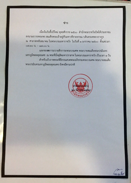20 ธ.ค.59 สำนักพระราชวัง แจ้งว่า เนื่องในวันขึ้นปีใหม่ พุทธศักราช 2560 สำนักพระราชวัง เปิดให้ประชาชนลงนามถวายพระพร สมเด็จพระเจ้าอยู่หัวมหาวชิราลงกรณ บดินทรเทพยวรางกูร ณ ศาลาสหทัยสมาคม ในพระบรมมหาราชวัง ในวันที่ 1 มกราคม 2560 ตั้งแต่เวลา 07.30 - 17.00 น.และของดการถวายสักการะพระบรมศพ พระบาทสมเด็จพระปรมินทรมหาภูมิพลอดุลยเดช ณ พระที่นั่งดุสิตมหาปราสาท ในพระบรมมหาราชวัง เป็นเวลา 1 วัน