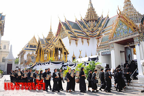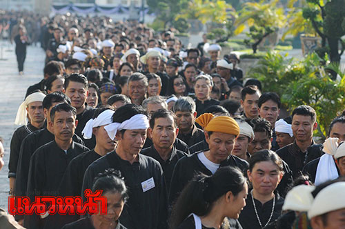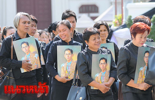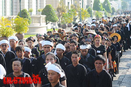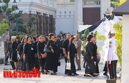 ด้าน น.ส.เมี๊ยะ มู๋ อู สาวเมียนมา อายุ 23 ปี พนักงานร้านอาหารแห่งหนึ่งในจังหวัดนครปฐม เดินทางมาพร้อมกับเพื่อนพนักงานในร้านอาหาร กล่าวว่า แม้ตนเป็นคนเมียนมาแต่ก็รู้จักและรักในหลวงรัชกาลที่ 9 เพราะพระองค์มีจิตใจดี พอทราบข่าวว่าเสด็จสวรรคตก็รู้สึกใจหาย เสียใจไม่แตกต่างจากคนไทย วันนี้เป็นวันหยุดเมื่อพี่ๆ ที่ทำงานชวนมาถวายบังคมพระบรมศพด้วยกัน จึงขอติดตามมาด้วยและจะถือโอกาสไปไหว้พระแก้วมรกตด้วย ตลอดระยะเวลาที่อยู่บนแผ่นดินของพระองค์นั้น ตนทำมาหากินด้วยความสุจริต มีเงินเก็บส่งให้ครอบครัวที่บ้านเกิดเมืองมะละแหม่ง มีความสุขมากเพราะคนไทยใจดี