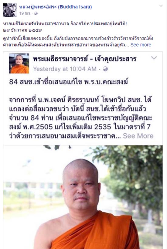 30ธ.ค.59 ผู้สื่อข่าวรายงานว่า หลวงปู่พุทธะอิสระ หรือพระสุวิทย์ ธีรธมฺโม เจ้าอาวาสวัดอ้อน้อย ต.ห้วยขวาง อ.กำแพงแสน จ.นครปฐม โพสต์ข้อความลงเฟซบุ๊คเพจชื่อ “หลวงปู่พุทธะอิสระ (Buddha Isara)” วิพากษ์วิจารณ์การเคลื่อนไหวต่อต้านการแก้ไขมาตรา 7 ของพ.ร.บ.สงฆ์ พ.ศ.2505 แก้ไขเพิ่มเติม พ.ศ.2535 ที่ 84 สมาชิก สนช.เสนอ และมีการนำเข้าสู่วาระการพิจารณาไปแล้วโดยมีมติเอกฉันท์ให้มีการแก้ไข 3 วาระรวดโดยให้การสถาปนาแต่งตั้ง “สมเด็จพระสังฆราช”นั้นเป็น พระราชอำนาจของพระมหากษัตริย์ พร้อมทั้งแก้ไขข้อบัญญัติเรื่องอาวุโสด้วยของพระเมธีธรรมาจารย์ หรือ เจ้าคุณประสาร จนฺทสาโร เลขาธิการศูนย์พิทักษ์พระพุทธศาสนาแห่งชาติ (ศพศ.) และรองอธิการบดีฝ่ายประชาสัมพันธ์และเผยแผ่ มหาวิทยาลัยมหาจุฬาลงกรณราชวิทยาลัย โดยระบุว่า หากพระเมธีธรรมาจารย์ไม่ยอมรับในพระราชอำนาจ ก็ออกไปหาประเทศอยู่ใหม่
