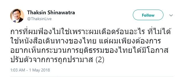 โดยผู้สื่อข่าวรายงานเมื่อช่วงบ่ายวันที่ 1 พฤษภาคม นายทักษิณ ได้โพสต์ข้อความผ่านทวิตเตอร์ส่วนตัว “https://twitter.com/ThaksinLive” ระบุว่า “วันนี้ศาลปกครองสูงสุดได้มีคำพิพากษายกฟ้อง คดีที่ผมฟ้องกระทรวงต่างประเทศที่ยกเลิกหนังสือเดินทางผมโดยมิชอบ ซึ่งก็ไม่ได้เกินความคาดหมาย การที่ผมฟ้องไม่ใช่เพราะผมเดือดร้อนอะไร ที่ไม่ได้ใช้หนังสือเดินทางของไทย แต่ผมเพียงต้องการอยากเห็นกระบวนการยุติธรรมของไทยได้มีโอกาสปรับตัวจากการถูกปรามาสว่า ถูกนำมาใช้เป็นเครื่องมือทางการเมืองจนไม่เป็นที่พึ่งของสังคม เพราะได้ดำเนินการไปโดยขัดหลักนิติธรรมสากล และเลือกปฏิบัติต่อคนเฉพาะกลุ่มเฉพาะฝ่ายมาโดยตลอด”