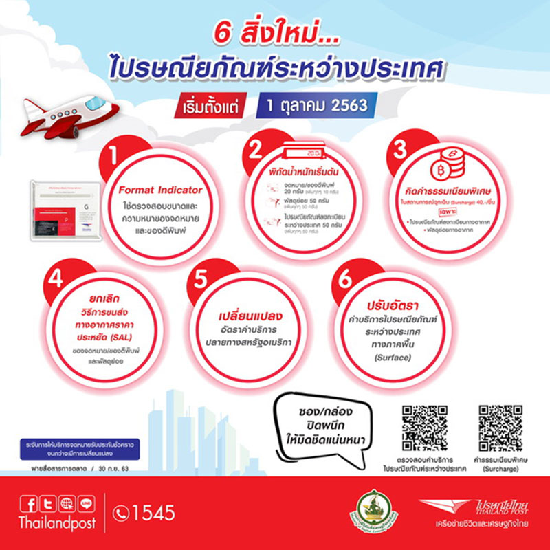 อย่างไรก็ตามโดยการปรับรูปแบบบริการไปรษณียภัณฑ์ระหว่างประเทศที่จะเปลี่ยนไปในครั้งนี้ อาทิ การวัดขนาดซองจดหมาย ของตีพิมพ์ด้วยเครื่องมือวัดขนาดสิ่งของ (Format Indicator) จดหมายมีขนาดไม่เกิน 305x381 มม. และหนาไม่เกิน 20 มม. กระดาษต้องแยกเป็นแผ่นๆได้ ไม่เป็นรูปเล่มและไม่มีวัสดุอื่นปะปน จดหมาย ของตีพิมพ์ น้ำหนักเริ่มต้นที่ 20 กรัม และคิดเพิ่มพิกัดละ 10 กรัม พัสดุย่อยน้ำหนักเริ่มต้นที่ 50 กรัม และคิดเพิ่มพิกัดละ 50 กรัม ไปรษณียภัณฑ์ลงทะเบียนระหว่างประเทศน้ำหนักเริ่มต้นที่ 50 กรัมและคิดเพิ่มพิกัดละ 50 กรัม ราคาขึ้นอยู่กับประเทศปลายทาง คิดค่าธรรมเนียมพิเศษในสถานการณ์ฉุกเฉิน (Surcharge) เฉพาะบริการพัสดุย่อยทางอากาศ (Air) และบริการลงทะเบียนทางอากาศ (Air) 40 บาท / ชิ้น ส่วนบริการจดหมายทางอากาศจะไม่เรียกเก็บ ปรับอัตราค่าบริการประเทศปลายทางสหรัฐอเมริกาตามข้อกำหนดของราคานำจ่ายภายในประเทศที่เรียกเก็บจากต้นทางทั่วโลก ปรับอัตราค่าบริการไปรษณียภัณฑ์ระหว่างประเทศทางภาคพื้น ยกเลิกบริการจดหมาย ของตีพิมพ์ และพัสดุย่อยระหว่างประเทศทางอากาศราคาประหยัด (SAL) ทุกประเทศปลายทาง ซึ่งสามารถใช้บริการขนส่งทางอากาศแทนได้ โดยทั้งหมดนี้มีผลตั้งแต่วันที่ 1 ตุลาคม 2563 เป็นต้นไป