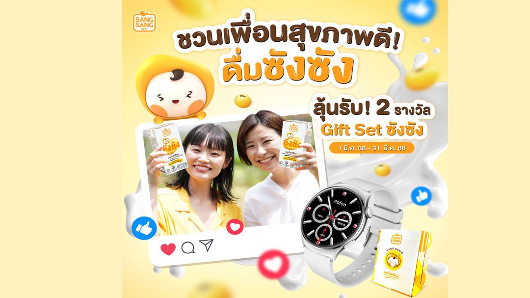 นอกจากนี้ ซังซังยังชวนทุกคนมาร่วมสนุกกับกิจกรรมดีๆ แค่ชวนเพื่อนๆ ดื่มซังซัง ใครชวนได้ถูกใจกรรมการก็ลุ้นรับ smart watch พร้อม Giftset ซังซัง 5 รางวัลไปเลย กติกาง่ายๆ เพียงแชร์โพสต์กิจกรรมนี้เป็นสาธารณะแล้ว tag เพื่อนชวนมาดื่มซังซัง จากนั้นถ่ายรูปดื่มซังซังโพสต์ลงโซเชียลใดก็ได้ของคุณ เปิดเป็นสาธารณะติดแฮชแทก #นมถั่วเหลือง #ซังซัง #SangSang #Soymilk แคปโพสต์ยืนยันใต้คอมเมนต์กิจกรรมนี้ ร่วมสนุกได้ตั้งแต่วันนี้ถึง 31 มีนาคม 2568 ประกาศรายชื่อผู้โชคดี 4 เมษายน 2568 ทาง FB: SangSang รายละเอียดเพิ่มเติมที่ https://bit.ly/3w0PQ5o