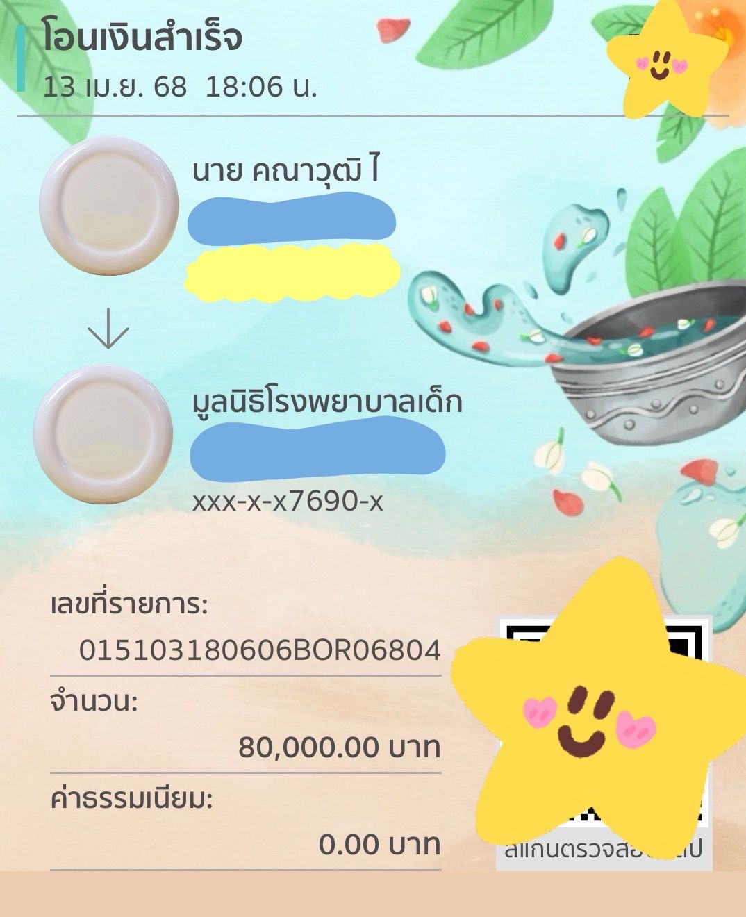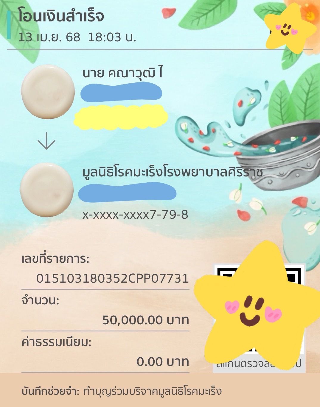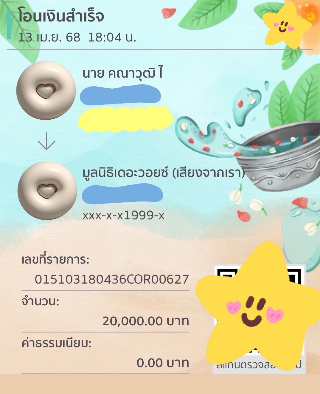 ทั้งนี้ทางหนุ่มกลัฟ ยังได้ร่วมทำบุญบริจาคเงินเพื่อสมทบทุนให้กับทางโรงพยาบาลเป็นทุนทรัพย์และจัดหาอุปกรณ์ทางการแพทย์ไว้รักษาผู้ที่เจ็บป่วยหรือผู้ที่มาใช้บริการให้เกิดประโยชน์ต่อไปในภายหน้าให้กับ 3 มูลนิธิ อาทิ มูลนิธิโรงพยาบาลเด็ก จำนวน 80,000 บาท , มูลนิธิโรคมะเร็งโรงพยาบาลศิริราช จำนวน 50,000 บาท , และมูลนิธิเดอะวอยซ์ (เสียงจากเรา) จำนวน 20,000 บาท รวมยอดบริจาคทั้งสิ้น 150,000 บาทเห็นแล้วแฟนคลับอิ่มเอม หัวใจเบิกบานไปพร้อม ๆ กันกับความกตัญญูของพ่อหนุ่มคนนี้มาโดยตลอด