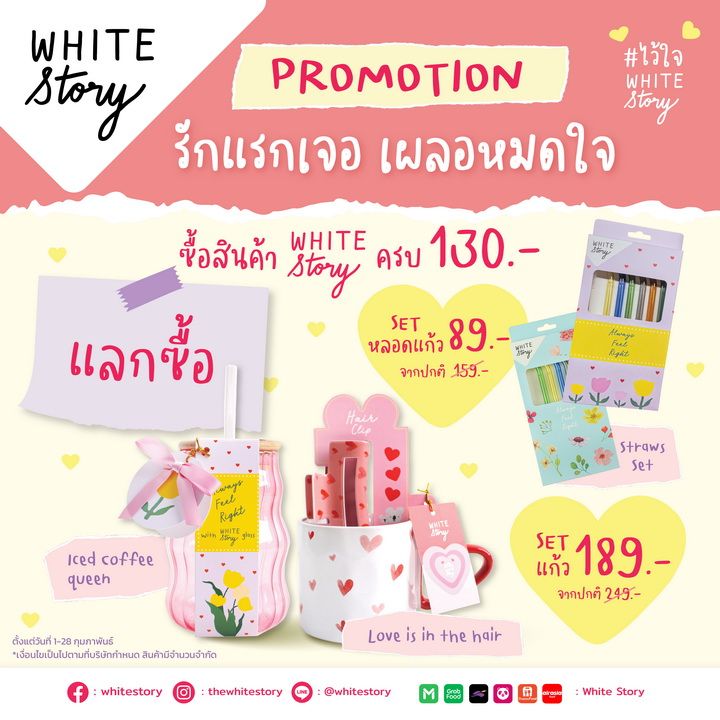 เอาใจคู่รักสายเร่งรีบเวลาน้อยต้องที่นี่ White Story ชั้น 1 ร้านเบเกอรี่และอาหารสุขภาพที่สะดวกรวดเร็ว ทำสดใหม่แบบวันต่อวัน ราคาจับต้องได้เมนูเริ่มต้นเพียง 50 บาท ทั้งข้าวหอมมะลิคั่วกลิ้งไก่สับ ข้าวคลุกกะปิ ข้าวญี่ปุ่นแท้หมูเกาหลี ขนมโดนใจหลากหลายเมนู ไม่ว่าจะเป็นขนมปังไดฟูกุชาเขียวถั่วแดงญี่ปุ่น เอแคลร์ไส้ครีมวานิลลา ขนมปังไส้นูเทลล่า และอีกเยอะมาก พิเศษเดือนเเห่งความรัก ที่จะเผลอตกหลุมรักไปกับโปรโมชั่นสุดอินเลิฟ “รักเเรกเจอ เผลอหมดใจ” เพียงซื้อสินค้าภายในร้าน ครบ 130 บาท สามารถเเลกซื้อ Set หลอดแก้ว ในราคา 89 บาท Set แก้ว ในราคา 189 บาท