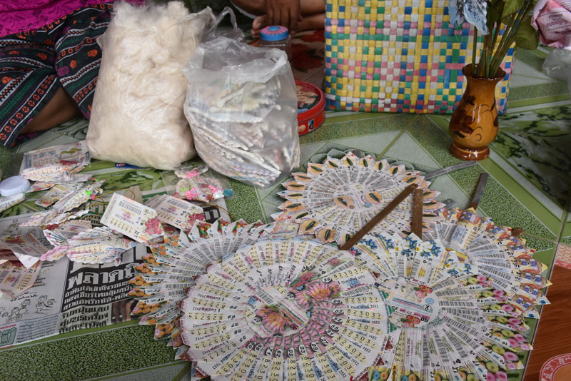 นอกจากนี้ยังรับจ้างพับด้วย เช่นคนที่จะซื้อรถยนต์ใหม่ก็จะนำธนบัตรใบละ 100 บาทมาให้ตนพับให้ สำหรับลอตเตอรี่เก่าจะได้จากตำรวจและทหารที่รู้จักกับสามี ทั้งสำนักงานที่ดินและหน่วยงานราชการต่าง ๆ เพราะที่ผ่านมาสามีเป็นตำรวจจราจรจะมีคนรู้จักเยอะ เมื่อได้มาก็จะนำลอตเตอรี่ไปให้หลวงพ่อที่มีชื่อเสียงและตนนับถือปลุกเสกให้ เพื่อสร้างความเชื่อถือให้กับผู้ซื้อ หากนำไปแขวนไว้ที่ร้านค้า ขายของดี ไปห้อยที่บ้านก็ดี ปลาตะเพียน ช่างเพียรช่างแวะ เงินทองไหลมาเวียนมา บางคนได้ปลาไปก็ซื้อข้องมาห้อยคู่กัน เพราะเป็นปลามงคล หากต้องการความร่มเย็นเป็นสุขก็แขวนไว้ 9 ตัว