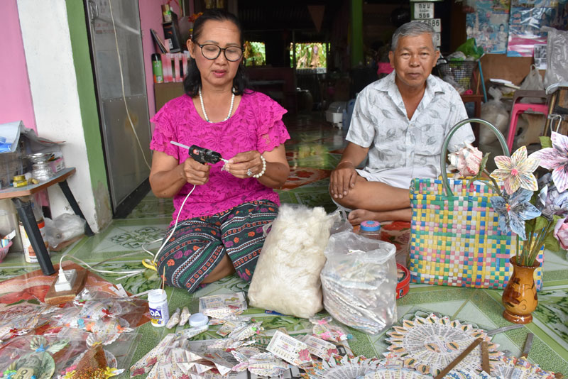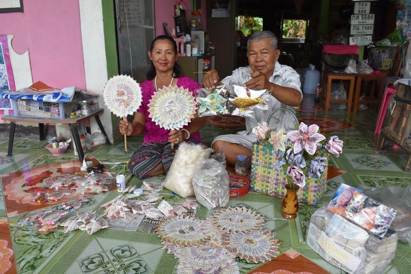 โดย นางบัวคำ สายหร่าย เปิดเผยว่า สามีได้ลาออกจากราชการก่อนเกษียณ เพราะป่วยเป็นโรคหัวใจโต เมื่อก่อนตนขายส้มตำจนเล็บมือเน่าเป็นแผลเพราะแพ้มะนาว เลยเลิกตำส้มตำแล้วไปเรียนทำโมบายที่ จ.พระนครศรีอยุธยา และทำขายมาได้ประมาณ 10 ปีแล้ว โมบายที่ทำจะทำเป็นปลาตะเพียน ปลาเงิน ปลาทอง และดอกกุหลาบ วัสดุที่ใช้ทำหลักๆก็คือลอตเตอรี่ และธนบัตรใบละ 20 บาท จะมีผู้สนใจมารับไปขายต่ออีกทอดหนึ่ง ส่วนปลาที่ใช้ธนบัตรใบละ 20 บาททำ ก็จะนำไปส่งที่วัดพระศรีรัตนมหาธาตุวรมหารหรือวัดใหญ่ วัดเด่นโบสถ์โพธิ์งาม จะคิดตัวละ 199 บาท