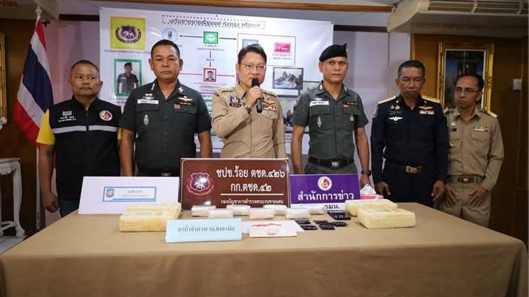 พ่อเมืองกระบี่นำทีมแถลงข่าวการจับกุมผู้ต้องหาพร้อมยาบ้า 56,010 เม็ด