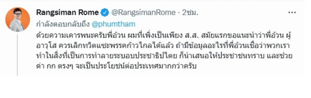 ภายหลังโพสต์ถูกเผยแพร่ออกไป ปรากฏว่านายรังสิมันต์ โรม ส.ส.บัญชีรายชื่อ และโฆษกพรรคก้าวไกล เข้าไปคอมเมนต์ว่า "ด้วยความเคารพนะครับพี่อ้วน ผมที่เพิ่งเป็นเพียง ส.ส. สมัยแรกขอแนะนำว่าพี่อ้วน ผู้อาวุโส ควรเลิกทวิตแซะพรรคก้าวไกลได้แล้ว ถ้ามีข้อมูลอะไรที่พี่อ้วนเชื่อว่าพวกเราทำในสิ่งที่เป็นการทำลายระบอบประชาธิปไตย ก็นำเสนอให้ประชาชนทราบ และช่วยด่า กก ตรงๆ จะเป็นประโยชน์ต่อประเทศมากกว่าครับ"