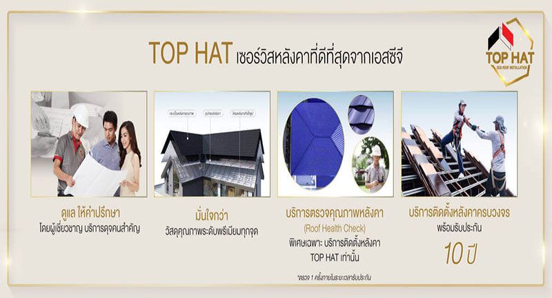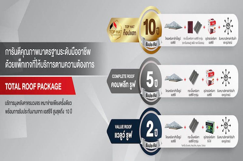 สำหรับแพ็กเกจมุงหลังคาบ้านใหม่ ที่ได้รับความนิยมสูงสุดใน Total Roof Package คือแพ็กเกจที่ดีที่สุดของ SCG ROOF INSTALLATION นั่นคือ ‘TOP HAT’ บริการมุงหลังคาระดับพรีเมียม ยืนยันด้วยเสียงตอบรับจากเจ้าของบ้านในงานบ้านและสวนแฟร์ 2022 ซึ่งถือว่าได้รับการตอบรับที่ดีเกินคาด โดย ‘TOP HAT’ มีจุดเด่นด้านเซอร์วิสงานหลังคาที่ดีที่สุดที่ให้บริการงานหลังคาครบวงจร ด้วยการดูแล ให้คำปรึกษา ตลอดจนการบริการมุงหลังคาโดยทีมช่างผู้เชี่ยวชาญด้านหลังคาโดยเฉพาะ ครอบคลุมทุกขั้นตอน ตั้งแต่การให้คำปรึกษา ถอดแบบประมาณการ ติดตั้ง และเหมามุงหลังคาแบบเบ็ดเสร็จ เจ้าของบ้านสร้างใหม่จึงมั่นใจเรื่องข้อมูลและความเชี่ยวชาญด้านการติดตั้ง ได้หลังคาสวยตรงใจไร้ปัญหา เฉพาะแพ็กเกจ TOP HAT ยังมีบริการ Roof Health Check หรือบริการตรวจสุขภาพหลังคาหลังการติดตั้งฟรี พร้อมรับประกันงานติดตั้งนานถึง 10 ปีเต็ม เพราะเรื่องสำคัญอย่าง ‘หลังคาบ้าน’ จำเป็นต้องเลือกช่างผู้เชี่ยวชาญจริง เพื่อให้งานหลังคาออกมาสวย แข็งแรงทนทานสมบูรณ์ที่สุด
