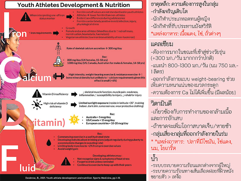 -สมดุลน้ำ : การขาดน้ำส่งผลต่อประสิทธิภาพ นักกีฬาวัยรุ่นอาจสูญเสียน้ำถึง 4% ของน้ำหนักตัว และควรดื่มน้ำอย่างเหมาะสม