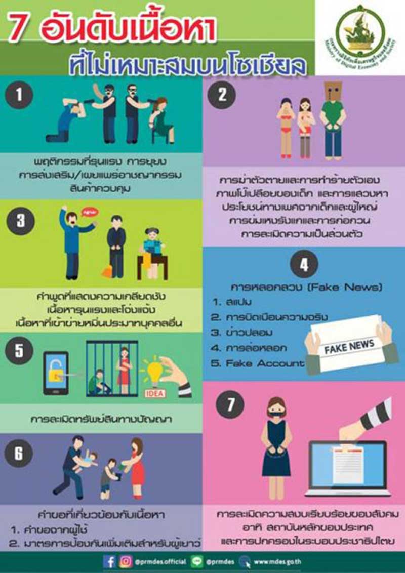 น.อ.สมศักดิ์ ขาวสุวรรณ์ รองปลัดกระทรวงดิจิทัลเพื่อเศรษฐกิจและสังคม (ดีอี) โฆษกประจำกระทรวง กล่าวว่า ปัจจุบันมีผู้ใช้อินเตอร์เนตผ่านโทรศัพท์สมาร์ทโฟนสูงถึง 180% ของประชากร และมีการใช้สื่อโซเชียลมีเดียสูงมาก โดยมีผู้ใช้งานเฟซบุ๊ค มากกว่า 54 ล้านคน ตามมาด้วยไลน์ 42 ล้านคน และทวิตเตอร์ 12 ล้านคน ซึ่งก่อให้เกิดความท้าทายต่อสภาพเศรษฐกิจ สังคม ศีลธรรม วัฒนธรรมและประเพณี และบางส่วนเป็นการใช้งานที่สุ่มเสี่ยงที่จะเกิดความขัดแย้งต่อกฎหมาย และกฎระเบียบของประเทศไทยในหลายกรณี ไม่ว่าจะเป็นกฎหมายว่าด้วยการกระทำความผิดเกี่ยวกับคอมพิวเตอร์ กฎหมายอาญาว่าด้วยการหมิ่นประมาท กฎหมายด้านการคุ้มครองข้อมูลส่วนบุคคล กฎหมายด้านทรัพย์สินทางปัญญา เป็นต้น