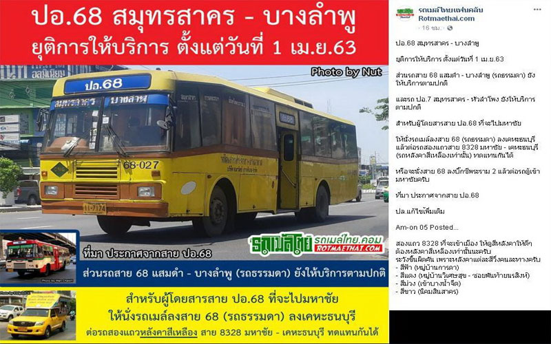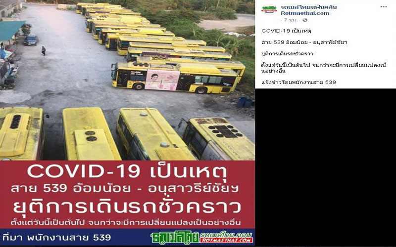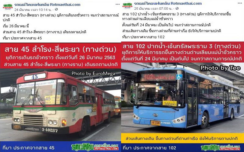 เมื่อวันที่ 27 มีนาคม 2563 สืบเนื่องจากสถานการณ์การระบาดของไวรัสโควิด-19 พบว่ามีรถประจำทางหลายสายที่ให้บริการในกรุงเทพฯ-ปริมณฑล ทั้งขององค์การขนส่งมวลชนกรุงเทพ (ขสมก.) และของเอกชน ประกาศหยุดให้บริการจนกว่าสถานการณ์จะกลับสู่ภาวะปกติ เฟซบุ๊กแฟนเพจ "รถเมล์ไทยแฟนคลับ Rotmaethai.com" ที่ให้ข้อมูลเกี่ยวกับเส้นทางการเดินรถสายต่างๆ ได้รวบรวมมาแจ้งให้ทราบ ดังนี้