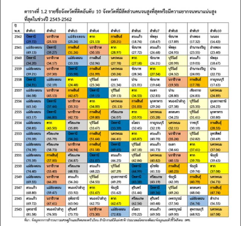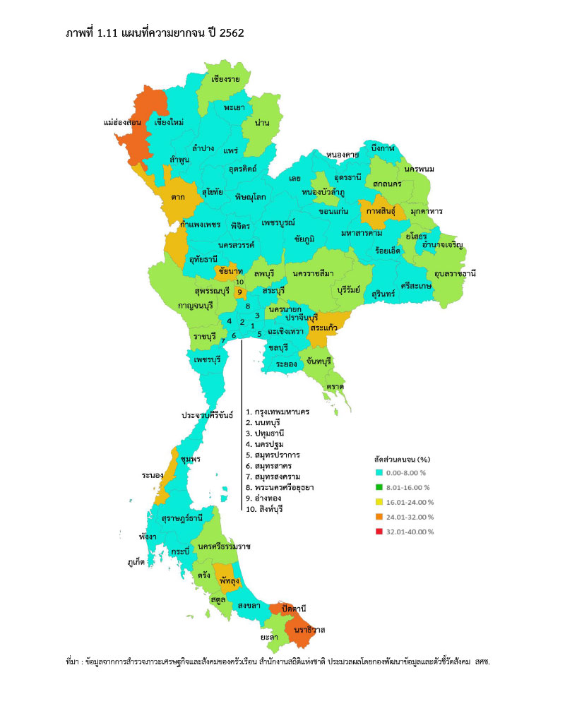 ทั้งนี้ สัดส่วนความยากจนลดลงเกือบทุกจังหวัด เมื่อพิจารณาความยากจนในระดับจังหวัด พบว่า ในปี 2562 ปัญหาความยากจนลดลงเกือบทุกจังหวัด ยกเว้น 9 จังหวัดที่มีสัดส่วนคนยากจนเพิ่มขึ้น ได้แก่ จังหวัดสมุทรปราการ จันทบุรี ฉะเชิงเทรา ชลบุรี อุบลราชธานี นครศรีธรรมราช สุราษฎร์ธานี เลย และสตูล