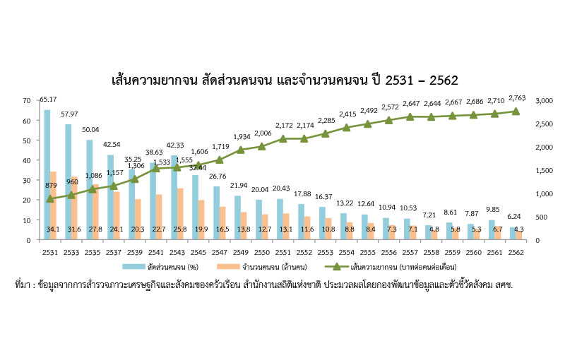 ทั้งนี้ เมื่อพิจารณาแนวโน้มของความยากจนระหว่างปี 2541-ถึงปัจจุบัน สัดส่วนและจำนวนคนจนมีแนวโน้มลดลงอย่างต่อเนื่อง จากจำนวนคนยากจน 25.8 ล้านคน หรือคิดเป็นสัดส่วนร้อยละ 38.63 ในปี 2541 ลดลงเหลือ 11.6 ล้านคน หรือร้อยละ 17.88 ในปี 2552 และลดลงเหลือ 4.3 ล้านคน หรือร้อยละ 6.24 ในปี 2562