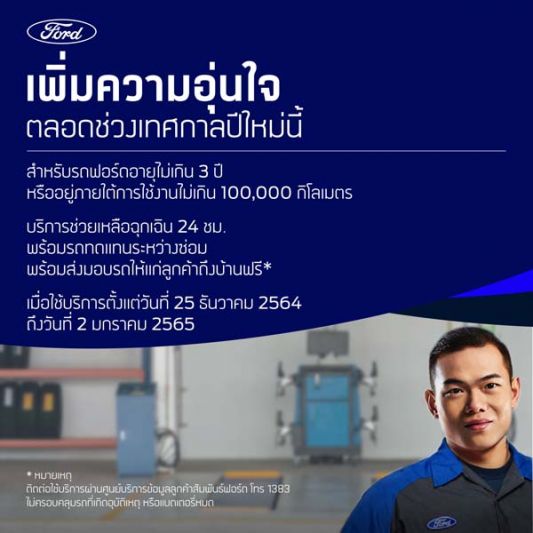 ฟอร์ด จัดโปรโมชั่นส่งท้ายปี ในช่วงวันหยุดเทศกาลปีใหม่ ด้วยการจัดบริการการช่วยเหลือฉุกเฉินบนท้องถนน 24 ชั่วโมง พร้อมบริการรถทดแทนระหว่างซ่อม และบริการส่งมอบรถให้แก่ลูกค้า โดยไม่มีค่าใช้จ่ายสำหรับเจ้าของรถฟอร์ด ที่อายุไม่เกิน 3 ปี หรือ ระยะทางการใช้งานไม่เกิน 100,000 กิโลเมตร ตั้งแต่วันนี้ ถึง 2 มกราคม 2565