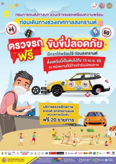 กรมการขนส่งทางบก รณรงค์เทศกาลสงกรานต์ จัดกิจกรรม “ตรวจรถฟรี ขับขี่ปลอดภัย” ตรวจเช็คความพร้อมรถยนต์และรถจักรยานยนต์เบื้องต้น ฟรี!!! ณ ศูนย์บริการของภาคีเครือข่ายภาครัฐ และเอกชนทั่วประเทศ
