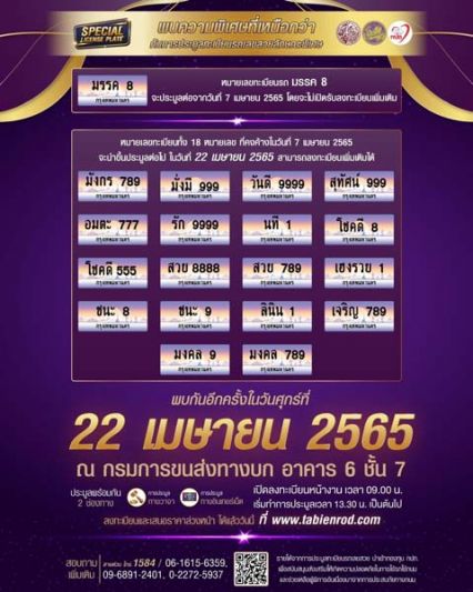 “หมายเลขทะเบียนรถที่มีลักษณะพิเศษ ที่จะนำออกประมูลในวันที่ 22 เมษายน 2565 นี้ ได้แก่ มรรค 8 ซึ่งจะดำเนินการประมูลต่อจาก วันที่ 7 เมษายน 2565 โดยไม่มีการลงทะเบียนเพิ่มเติม เนื่องจากระบบการประมูลขัดข้องขณะที่การประมูลหมายเลขดังกล่าวยังไม่เสร็จสิ้น สำหรับหมายเลขที่สามารถลงทะเบียนเข้าร่วมการประมูลเพิ่มเติมได้ ประกอบด้วย มังกร 789, มั่งมี 999, วันดี 9999, สุทัศน์ 999, อมตะ 777, รัก 9999, นที 1, โชคดี 8, โชคดี 555, สวย 8888, สวย 789, เฮงรวย 1, ชนะ 8, ชนะ 9, ลินิน 1, เจริญ 789, มงคล 9 และ มงคล 789 ซึ่งคาดว่ารายได้จากประมูลหมายเลขทะเบียนรถเลขสวยลักษณะพิเศษ เมื่อรวมกับ 63 หมายเลข ที่ได้ประมูลไปก่อนหน้านี้ จะนำรายได้นำเข้ากองทุนเพื่อความปลอดภัย ในการใช้รถใช้ถนน (กปถ.) เพื่อนำไปใช้ตามวัตถุประสงค์ได้ไม่ ต่ำกว่า 300 ล้านบาท”
