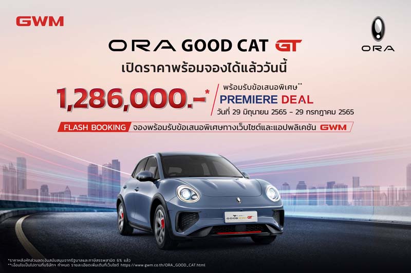 เกรท วอลล์ มอเตอร์ ประกาศราคา ORA Good Cat GT จาก 1,549,000 บาท หักส่วนลดและสิทธิประโยชน์จากทางภาครัฐ จะอยู่ที่ 1,286,000 บาท พร้อมเปิดให้จองเป็นเจ้าของ 500 คันแรก ตั้งแต่วันนี้ จนถึงวันที่ 29 ก.ค. 2565 เวลา 23.59 น. เตรียมส่งมอบลอตแรกเดือนพ.ย.นี้