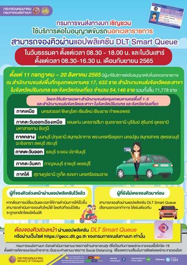 “เดือนกันยายน 2565 จะเป็นเดือนสุดท้ายในการให้บริการต่อใบอนุญาตขับรถนอกเวลาราชการ กรมการขนส่งทางบก ขอเชิญชวน ผู้ที่ต้องการต่อใบอนุญาตขับรถ สามารถจองคิวล่วงหน้าผ่านแอปพลิเคชั่น DLT Smart Queue ทั้งวันธรรมดา (ยกเว้นวันหยุดนักขัตฤกษ์) นอกเวลาราชการ ซึ่งจะให้บริการตั้งแต่เวลา 08.30- 18.00 น. และวันเสาร์ระหว่างเวลา 08.30-16.30 น. โดยจะให้บริการเฉพาะสำนักงานขนส่งกรุงเทพมหานครพื้นที่ 1-5 และสำนักงานขนส่งจังหวัดและสาขา ในจังหวัดปริมณฑล และจังหวัดท่องเที่ยว ประกอบด้วย ภาคกลาง นนทบุรี ปทุมธานี สมุทรปราการ พระนครศรีอยุธยา นครปฐม สมุทรสาคร สุพรรณบุรี ฉะเชิงเทรา ลพบุรี สระบุรี