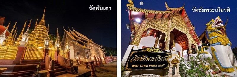 เดินเล่นชิม ช้อปของพื้นเมืองไปเรื่อย ๆ แล้วเลี้ยวซ้ายไปถึง “วัดพันเตา”ชมวิหารหอคำไม้สัก ภายในประดิษฐานพระเจ้าปันเต้า (พันเท่า) เป็นที่เคารพนับถือของชาวเชียงใหม่ ด้วยมีความหมายอันเป็นมงคลว่า "มีความสำเร็จเพิ่มพูนเป็นร้อยเท่าพันเท่า" ด้านหลังวิหารหอคำ คือ เจดีย์ทรงระฆังบนฐานแปดเหลี่ยมรายล้อมด้วยเหล่าเจดีย์สีทองส่องสว่าง เมื่อเดินต่อมาตามถนนราชดำเนินที่เต็มไปด้วยร้านค้ามากมาย จะพบกับ “วัดชัยพระเกียรติ”ด้วยแสงไฟที่ส่องสว่างพระวิหารเผยให้เห็นหน้าบันประดับด้วยลายปูนปั้นพรรณพฤกษาสีทองบนพื้นกระจกสีน้ำเงิน กลางหน้าบันเป็นรูปเทพพนม บันไดมีสิงห์ปูนปั้นสองตัวตั้งไว้เป็นทวารบาล ภายในประดิษฐาน “พระพุทธรูปเมืองราย” ที่มีความเชื่อกันว่าผู้ใดมาสักการะกราบไหว้จะรอดพ้นจากภัยอันตรายต่างๆ และมีชัยในสิ่งที่หวัง