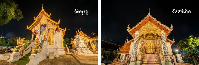 แม้จะเกือบสุดเส้นถนนคนเดินที่ระยะทางกว่า 1 กิโลเมตร ร้านค้าและนักท่องเที่ยวก็ไม่ได้ลดน้อยลงยังคงคึกคักและสว่างไสวไปตลอดเส้นทางโดยเฉพาะภายใน “วัดทุงยู” ที่เราจะได้เห็นอุโบสถศิลปะล้านนา สร้างด้วยคอนกรีตหินอ่อนลงรักปิดทอง เครื่องบนมีช่อฟ้าใบระกา ทาด้วยไม้สักปิดทองที่ได้รับการบูรณะใหม่ เสียงลือว่าหลวงพี่ที่วัดแห่งนี้ดูดวงแม่นยำนัก คงต้องลองไปสักครั้งและสุดถนนคนเดินยังมี “วัดศรีเกิด” ที่ภายในวัดคราคร่ำไปด้วยร้านค้าและผู้คนมากมายที่เข้าไปเลือกซื้อสินค้าและชมความงามของพระวิหารภายในประดิษฐานพระเจ้าแข้งคมเป็นพระพุทธรูปปางมารวิชัยขนาดใหญ่ ขัดสมาธิราบ หล่อขึ้นจากสัมฤทธิ์ลงรักปิดทอง ในวัดมีต้นศรีมหาโพธิ์ พันธุ์มาจากต้นโพธิ์ที่ตรัสรู้ของพระพุทธเจ้าที่ประเทศอินเดีย เป็นที่เคารพบูชาของศาสนิกชนจำนวนมาก
