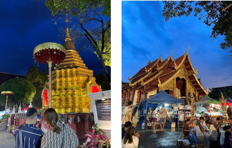 เมื่อเราก้าวเข้าสู่ถนนคนเดินท่าแพ สายตาจะปะทะกับร้านค้ามากมายตลอดสองข้างทาง ทั้งนักท่องเที่ยวและบรรยากาศคึกคักที่หายไปเกือบสองปีกลับมามีชีวิตอีกครั้งด้านขวามือเราจะพบกับ “วัดหมื่นล้าน”เมื่อได้ลองเดินเข้าไปภายในวัด นอกจากจะตื่นตาตื่นใจกับร้านรวงมากมายแล้ว ก็ต้องตกตะลึงกับความสวยงามสว่างไสวของเจดีย์และลวดลายหน้าบันของวิหาร ศิลปะแบบพม่าสะท้อนแสงไฟจาก LED จนอดใจไม่ได้ที่จะต้องหยิบมือถือขึ้นมาเก็บภาพตรงหน้าภายในประดิษฐานพระพุทธรูปปางมารวิชัย วัชราสน์ (ขัดสมาธิเพชร) อายุเก่าแก่กว่า 100 ปีผู้คนหลั่งไหลมากราบไหว้ด้วยแรงศรัทธาและหวังร่ำรวยเหมือนชื่อวัดเดินต่อไปฝั่งตรงข้ามบรรยากาศคึกคักยิ่งหย่อนไม่แพ้กันกับ “วัดพันอ้น”ร้านค้ามากมายเปิดรายล้อมเจดีย์สีทองเหลืองอร่ามทรงแปดเหลี่ยมซึ่งภายในบรรจุพระบรมสารีริกธาตุ อุโบสถเป็นที่ประดิษฐานพระพุทธชินราชจำลองเจดีย์สีทองส่องสว่างด้วยไฟLED เผยให้เห็นรอยยิ้มแห่งความหวังของบรรดาพ่อค้าแม่ค้าและความสุขใจของนักท่องเที่ยว เดินต่อไปอีกนิดจะถึง “วัดสำเภา”แสงไฟส่องสว่างให้เห็นวิหารศิลปะล้านนาอย่างเด่นชัด ตัวอาคารตั้งอยู่บนฐานยกสูง หลังคาซ้อนกันสามชั้น หน้าบันตลอดจนตัวเสาประดับด้วยลายปูนปั้นเป็นรูปเทวดา ลายพรรณพฤกษาและสัตว์ต่าง ๆ บันไดทางขึ้นเป็นมกรคายนาค ภายในประดิษฐานพระพุทธรูปปางมารวิชัยงดงามสะกดสายตา