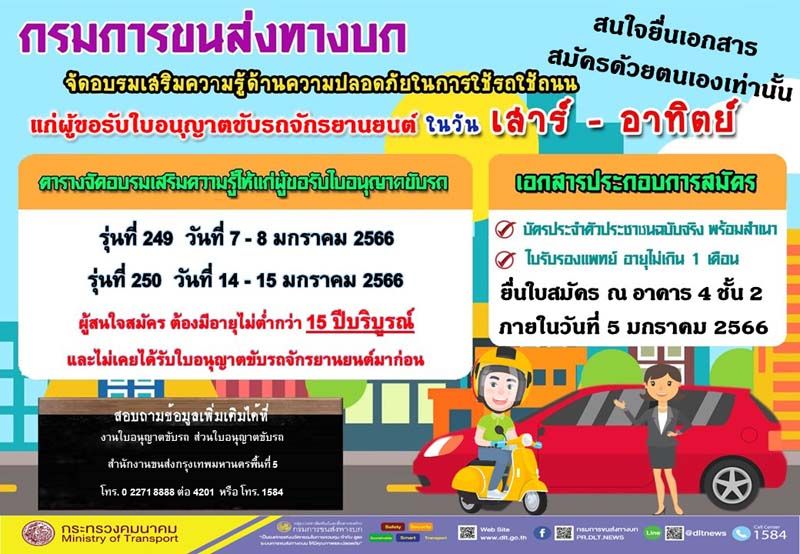 ทั้งนี้ กรมการขนส่งทางบก จะจัดโครงการอบรมเสริมความรู้ ด้านความปลอดภัยในการใช้รถใช้ถนนแก่ ผู้ขอรับใบอนุญาตขับรถจักรยานยนต์ ตลอดทั้งปี พ.ศ. 2566 ประชาชนผู้สนใจสอบถามข้อมูลเพิ่มเติมได้ที่งานใบอนุญาตขับรถ ส่วนใบอนุญาตขับรถ สำนักงานขนส่งกรุงเทพมหานครพื้นที่ 5 โทร 0 2271 8888 ต่อ 4201 หรือโทรสายด่วนกรมการขนส่งทางบก 1584