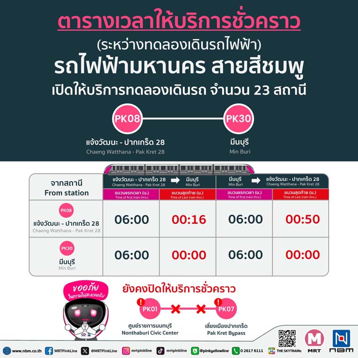 26 ธันวาคม 2566 เพจ “รถไฟฟ้ามหานคร สายสีชมพู” แจ้งตารางเวลาให้บริการชั่วคราว (ระหว่างทดลองเดินรถไฟฟ้า) รถไฟฟ้ามหานคร สายสีชมพู เปิดให้บริการทดลองเดินรถ จำนวน 23 สถานี