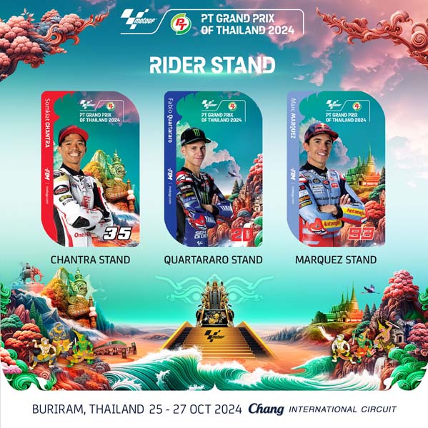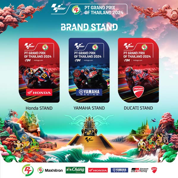 “แบรนด์ สแตนด์” สำหรับกองเชียร์จากค่ายรถจักรยานยนต์ชั้นนำ ชูความแข็งแกร่งของนักบิดซูเปอร์สตาร์โมโตจีพี ของแต่ละค่าย ได้แก่ บัตรดูคาติ สแตนด์เป็นภาพรถแข่งหมายเลข 1 “ฟรานเชสโก้ บันยาญ่า”, ยามาฮ่า สแตนด์ ภาพ “ฟาบิโอ กวาร์ตาราโร” รถหมายเลข 20 ส่วนบัตรฮอนด้า สแตนด์ เป็นภาพ “ลูก้า มารินี่” รถหมายเลข 10