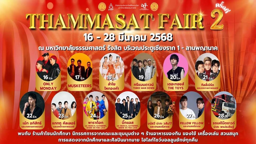 มหาวิทยาลัยธรรมศาสตร์ แจ้งข่าวว่า กลับมาอย่างยิ่งใหญ่ กับ “ธรรมศาสตร์แฟร์ 2568 “ จัดเต็มความสนุก 13 วันเต็ม 16-28 มีนาคม 2568 ณ มหาวิทยาลัยธรรมศาสตร์ ศูนย์รังสิต (ตลาดนัดเชียงราก - ลานพญานาค) ครบทุกโซน ฟินทุกวัน ไม่ว่าจะเป็น โซนร้านค้านักศึกษา ร้านอาหาร และของใช้ที่รังสรรค์กันอย่างสุดฝีมือ กิจกรรมสุดสร้างสรรค์ จากองค์การนักศึกษา มหาวิทยาลัยธรรมศาสตร์ อาทิ เทศการดนตรี Musical Gathering: Where We Find Love เทศกาลที่พาผู้คนมาพบกันด้วยความหลงใหลในเสียงดนตรี สู่พื้นที่ที่หลอมรวมไปด้วยความรักแห่งเสียงเพลงและมนต์เสน่ห์ของความหลากหลายทางวัฒนธรรมดนตรี