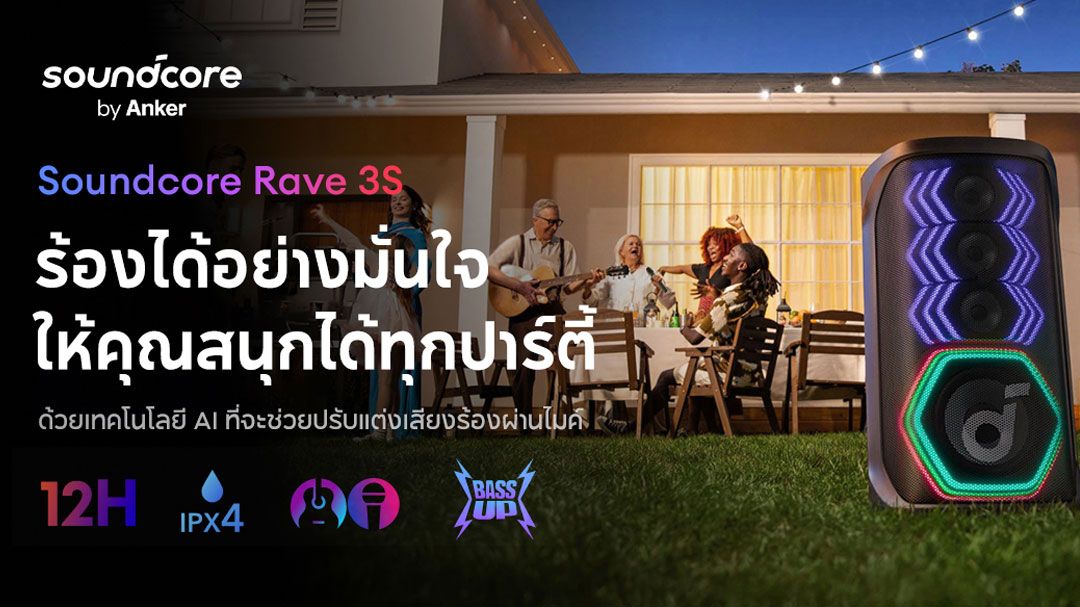 Soundcore แบรนด์เครื่องเสียงระดับพรีเมียมในเครือของ Anker Innovations เปิดตัวผลิตภัณฑ์ใหม่ล่าสุด “Soundcore Rave 3S” ลำโพงตัวรุ่นล่าสุดในตระกูลลำโพงปาร์ตี้ Rave ที่น่าจับตามอง Rave 3S โดดเด่นด้วยพลังเสียงที่ทรงพลังถึง 200 วัตต์ พร้อมเบสที่ลึกและกระหึ่ม ตอบโจทย์ความต้องการของผู้ที่รักการฟังเพลงอย่างเต็มอรรถรส และระบบแสงไฟที่ซิงค์ตามจังหวะเพลง ช่วยสร้างบรรยากาศปาร์ตี้ได้ในทันทีที่เปิดใช้งาน นอกจากนี้ Soundcore Rave 3S ยังนำเทคโนโลยี AI มาประยุกต์ใช้ ซึ่งสามารถลบเสียงร้องหรือเพิ่มประสิทธิภาพเสียงร้องและเสียงก้องได้ตามต้องการ มอบประสบการณ์คาราโอเกะระดับมืออาชีพให้กับผู้ใช้ทุกคน Soundcore Rave 3S จึงเป็นตัวเลือกที่เหมาะสมอย่างยิ่งสำหรับการจัดกิจกรรมสังสรรค์ในครอบครัว ไม่ว่าจะเป็นปาร์ตี้ในสวนหลังบ้าน หรืองานริมสระว่ายน้ำ โดยมาพร้อมไมโครโฟนไร้สายจำนวน 2 ตัว เพื่อให้ทุกคนได้ร่วมสนุกกับความบันเทิงอย่างเต็มที่