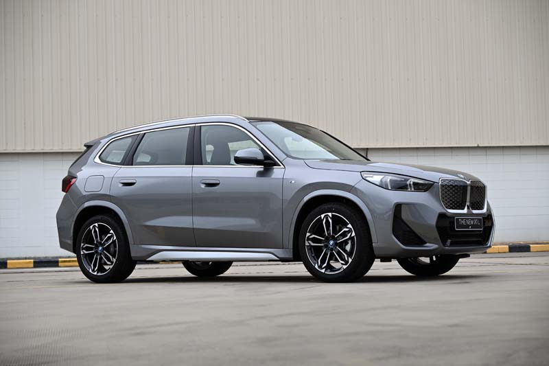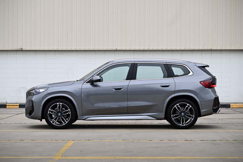 บีเอ็มดับเบิลยู iX1 eDrive20L M Sport ใหม่ มาพร้อมดีไซน์ภายนอก ที่แตกต่างจาก X1 รุ่นมาตรฐานอย่างชัดเจน ทั้งยังยกระดับความกว้างขวางของห้องโดยสาร ด้วยความยาวตัวถังเพิ่มเป็น 4,616 มม. และฐานล้อยาว 2,800 มม. เสริมด้วยกระจังหน้า แบบปิดดีไซน์ใหม่ทรงสามมิติ เข้าชุดกับไฟหน้า Adaptive LED เส้นสายด้านข้างสะท้อนความสปอร์ต ดุดัน ตลอดทั้งคัน พร้อมชุดแต่ง M Sport หรูหราและลงตัว ทั้งกรอบหน้าต่าง high-gloss Shadowline, ราวหลังคาอลูมิเนียมผิวด้าน และล้ออัลลอย ขนาด 19 นิ้วลาย Double-spoke Bicolour