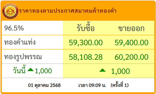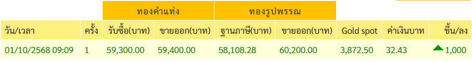 1 ตุลาคม 2568 สมาคมค้าทองคำ รายงานว่า ราคาทองไทยวันนี้ ครั้งที่ 1 เมื่อเวลา 9.09 น. พบปรับเพิ่ม 1,000 บาท ส่งผลให้ราคาทองคำแท่งรับซื้อบาทละ 59,300.00 บาท ขายออกบาทละ 59,400.00 บาท ส่วน "ราคาทองรูปพรรณ" รับซื้อบาทละ 58,108.28 บาท ขายออกบาทละ 60,200.00 บาท