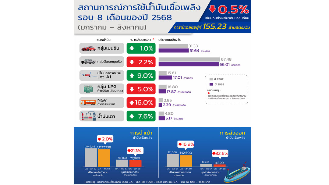 นายสราวุธ แก้วตาทิพย์ อธิบดีกรมธุรกิจพลังงาน เผยภาพรวมการใช้น้ำมันเชื้อเพลิง ในช่วงเดือนมกราคม - สิงหาคม 2568 มีปริมาณอยู่ที่ 155.23 ล้านลิตร/วัน ลดลงร้อยละ 0.5 เมื่อเทียบกับช่วงเดียวกันของปีก่อน โดยก๊าซธรรมชาติสำหรับยานยนต์ (NGV) มีปริมาณการใช้ลดลงสูงสุด ที่ร้อยละ 16 ตามด้วยก๊าซปิโตรเลียมเหลว (LPG) ลดลงร้อยละ 5.0 และน้ำมันดีเซลหมุนเร็วลดลงร้อยละ 2.2 ขณะที่น้ำมันอากาศยานเชิงพาณิชย์ (Jet A1) มีปริมาณการใช้เพิ่มขึ้นร้อยละ 9.0 การใช้น้ำมันเตาเพิ่มขึ้นร้อยละ 7.6 และกลุ่มเบนซินเพิ่มขึ้นร้อยละ 1.0