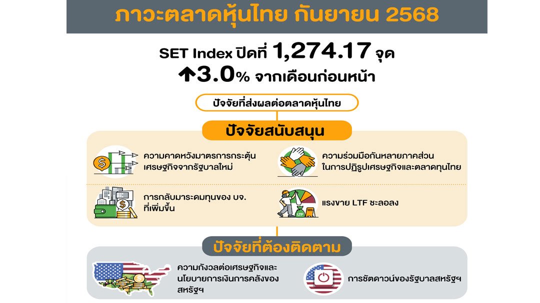 ความคาดหวังมาตรการกระตุ้นเศรษฐกิจของรัฐบาลที่จัดตั้งขึ้นใหม่เป็นปัจจัยสนับสนุนตลาดหุ้นไทย ขณะที่ ความกังวลเกี่ยวกับเศรษฐกิจและนโยบายการเงินการคลังของสหรัฐฯ ส่งผลให้ผู้ลงทุนมีความต้องการสินทรัพย์ปลอดภัยเพิ่มขึ้น โดยเฉพาะทองคำที่ราคาในตลาดโลกปรับเพิ่มขึ้นสูงสุดเป็นประวัติการณ์ สำหรับกรณีรัฐบาลสหรัฐฯ ชัตดาวน์ ซึ่งเคยเกิดขึ้นแล้วหลายครั้งในอดีต และส่วนใหญ่ใช้ระยะเวลาไม่นาน ผู้ลงทุนจึงไม่ได้ตระหนกกับประเด็นดังกล่าวมากนัก สะท้อนจากตลาดหุ้นสหรัฐฯ ที่ไม่ได้ปรับตัวลงอย่างมีนัยสำคัญในช่วงที่ผ่านมา จากปัจจัยดังกล่าว ดัชนี SET Index ในเดือนกันยายน 2568 ปรับตัวเพิ่มขึ้น 3.0% จากสิ้นเดือนก่อนหน้า มาปิดที่ 1,274.17 จุด