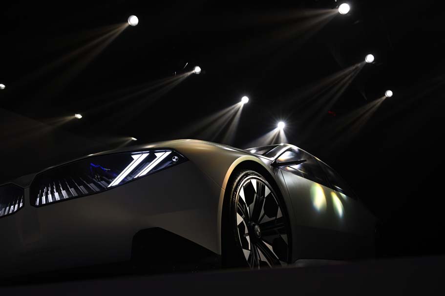 ด้านหน้าของ Vision Neue Klasse สดใหม่ด้วยการนำเอกลักษณ์ของบีเอ็มดับเบิลยูอย่างกระจังหน้าทรงไตคู่ มาตีความด้วยมุมมองที่แตกต่าง โดยกระจังหน้าดีไซน์ใหม่ถูกหลอมรวมเป็นชิ้นเดียวกับไฟหน้า ซึ่งประกอบไปด้วยไฟดวงเล็กจำนวนมาก โดยแต่ละดวงสามารถตั้งค่าการส่องสว่างได้แยกจากกัน ติดตั้งอยู่ใต้ผิวหน้าที่เป็นกระจกให้เกิดเป็นดีไซน์ที่จับทุกสายตาด้วยความลึกจากชิ้นส่วนที่เล่นระดับ ส่วนไฟส่องสว่างในเวลากลางวัน (Daytime Running Lights) มาในรูปแถบไฟเฉียงบริเวณด้านข้าง ทำมุมตัดกับชุดไฟหน้าหลัก แนวคิดการออกแบบชุดไฟหน้านี้ยังถูกนำไปปรับใช้กับไฟท้าย ซึ่งประกอบขึ้นจากชิ้นส่วนที่ผลิตจากการพิมพ์แบบสามมิติ เพื่อสร้างรูปลักษณ์ที่มีมิติและความลึกในลักษณะเดียวกัน