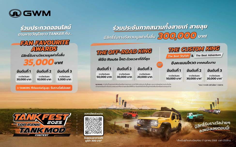 GWM (Thailand) เนรมิตพื้นที่ขนาดใหญ่กว่า 50,000 ตารางเมตร ให้เป็นลานกิจกรรมสุดเร้าใจ เปิดพื้นที่สำหรับแฟนพันธุ์แท้ GWM TANK ทั้งสายออฟโรดและสายชิลล์ ผู้ที่ชื่นชอบการแต่งรถให้เป็นพื้นที่ได้ปล่อยของ ปลดปล่อยจินตนาการ และความคิดสร้างสรรค์ได้อย่างไร้ขีดจำกัด ผ่านกิจกรรมความสนุก ที่อัดแน่นในทุกตารางนิ้ว ทั้งเวทีประกวด และจัดแสดงรถแต่ง การแข่งขันการขับขี่ออฟโรด สนามทดสอบสมรรถนะ พร้อมกิจกรรมความสนุกมากมาย ในวันเสาร์ที่ 18 ต.ค. 2568 ณ ESC Park รังสิต จ.ปทุมธานี และวันอาทิตย์ที่ 19 ต.ค. 2568 สำหรับผู้ที่สนใจทดลองขับ GWM